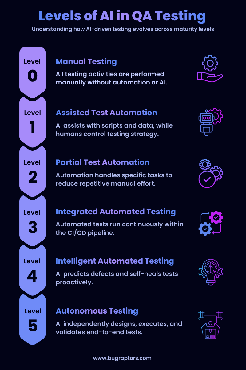 To implement AI in QA testing effectively, organizations must understand their position on the maturity curve. This evolution is categorized into six distinct levels, guiding teams from manual efforts to fully autonomous systems.Level 0: Manual Testing